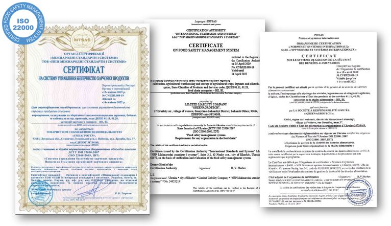 Our company is ISO-22000 certified. We also cooperate with the independent private & state accredited labs to monitor & confirm the highest quality of our seeds & their compliance with the European quality requirements.